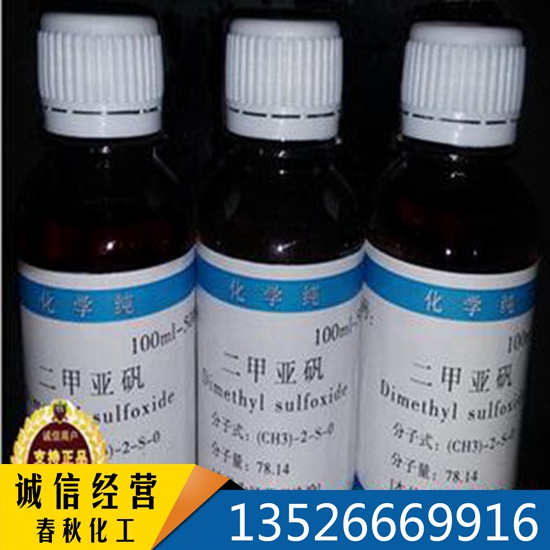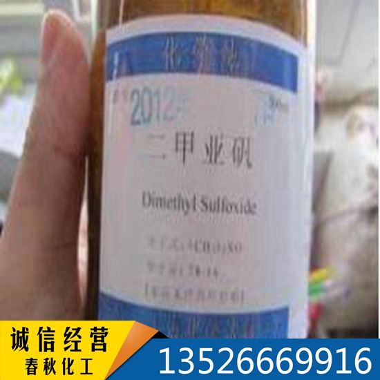 二甲亚矾,又名 DMSO,为无色有粘性的液体,味微苦,无臭或微臭;有强吸湿性;比重为1.099—1.101。能与水、乙醇、丙酮、氯仿、乙醚与大多数有机溶媒任意混合,不能与石蜡烃